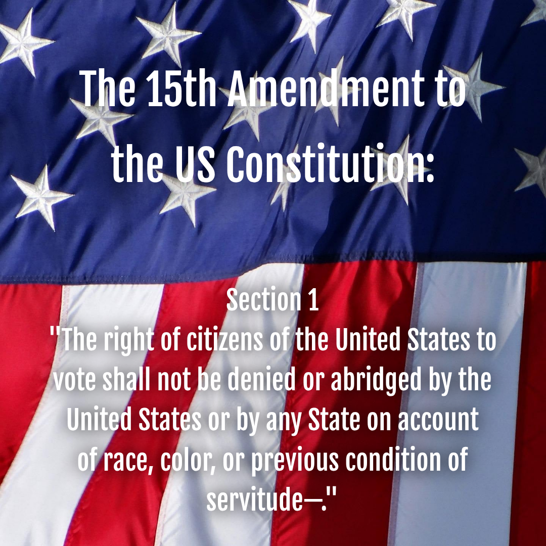 Against a background of the American flag, the words of Section 1 of the 15th Amendment to the U.S. Constitution: "The right of citizens of the United States to vote shall not be denied or abridged by the United States or by any State on account of race, color, or previous condition of servitude—"